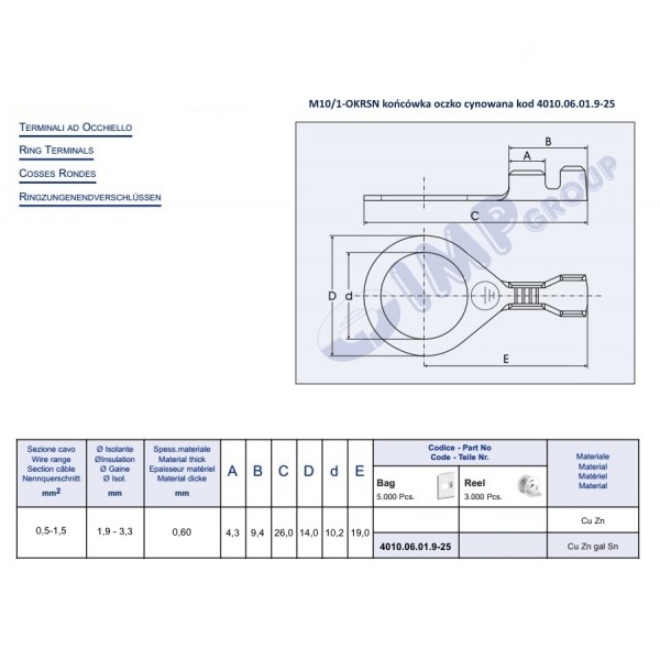 Konektor oczko M10/1-OKRSN okrągły, śr. 10,2mm, nieizolowany, na przewód φ0,5-1,5mm2, materiał styku: mosiądz cynowany, opakowanie 25szt.